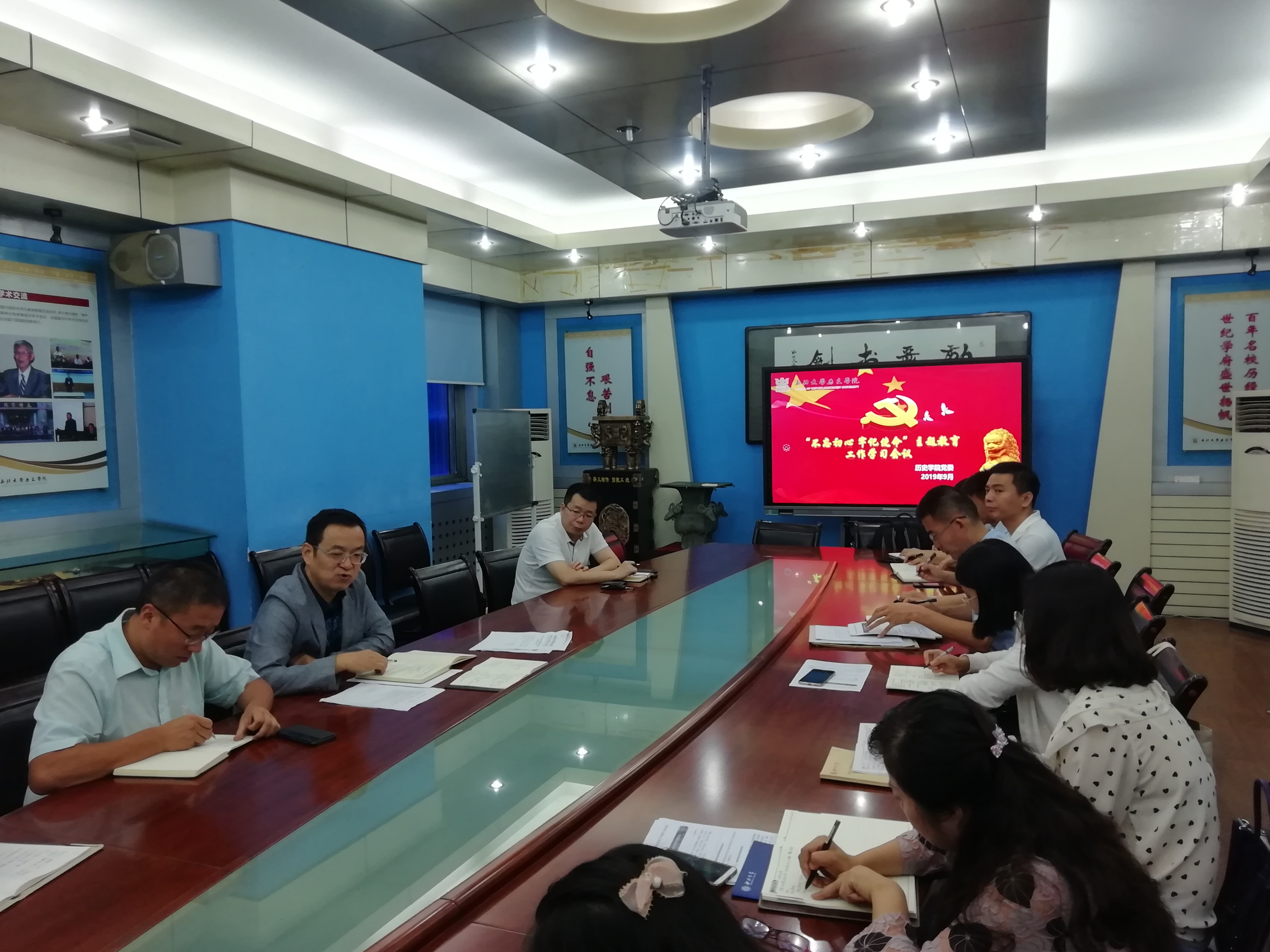 2019年9月11日下午,球盟会qmh党委召开党委中心组专题学习会议(扩大)。会议由球盟会qmh党委书记赵万峰同志主持,学院党委中心组成员、学院党委科级以上干部、全体党支部书记、辅导员参加了本次会议。