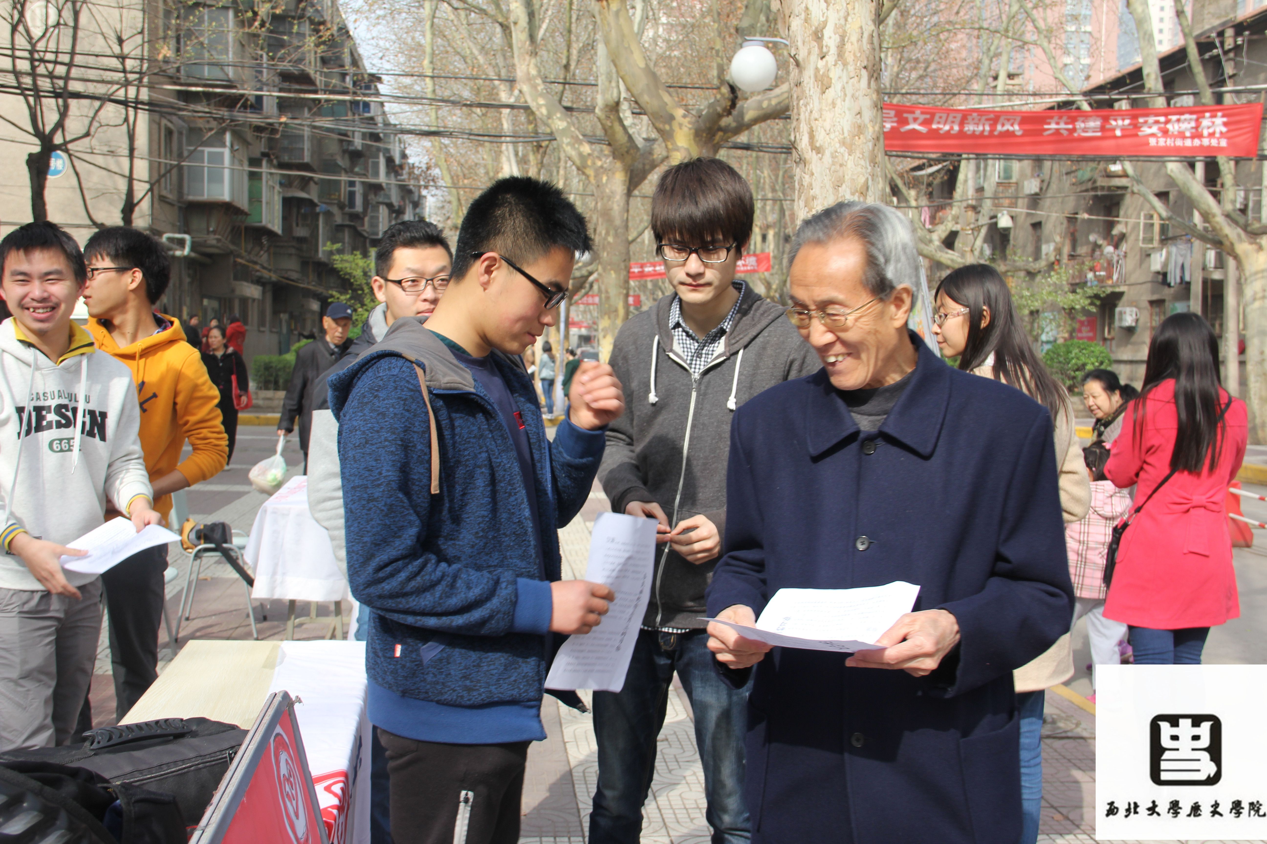 在协会负责人赵茜同学的有力组织之下,小伙伴们搬桌挪椅,展示横幅,照相留影,捡拾垃圾,迅速进入了状态。在介绍农历三月三这天对于中华文化的重要意义时,我们既在赞许的目光下享受着向爷爷奶奶、叔叔阿姨普及知识的快乐,同时也感受到很多西大老教授丰富的学识和高远的见识。他们这些老学者对球盟会qmh的本次活动表示了很大的兴趣和肯定,同时在交流中让我们感受到了老一辈学者的大家风范,使我们受益匪浅。活动现场随处可见西大志愿者可爱的身影和挺拔亮丽的身姿,老年和青年在朝阳的映衬下谱写了一曲和谐的人生篇章。