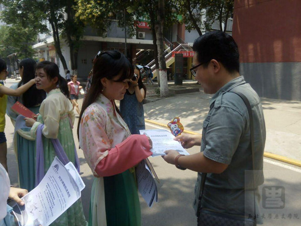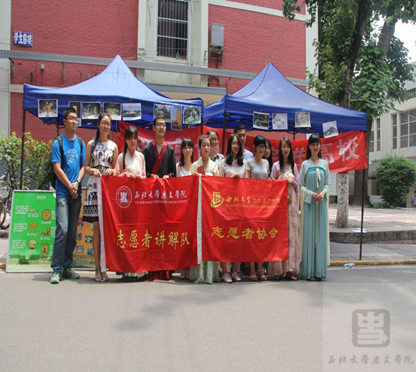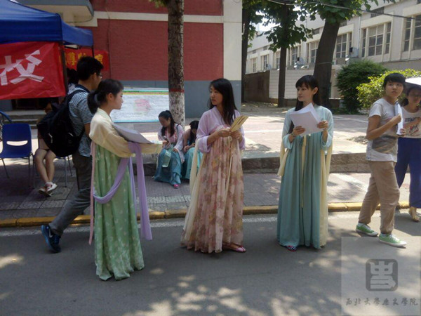 12时许,活动在生活区正式开始。两院联合西博进行了文物图片展示、展板解说以及宣传手册(单)发放等一系列活动。学生们身穿汉服,向来往师生讲述西安博物院的发展历程与其中部分文物的珍贵价值,希望更多的人了解西安、了解西博,进而爱上这座城市,爱上她辉煌的历史和灿烂的文化遗产。