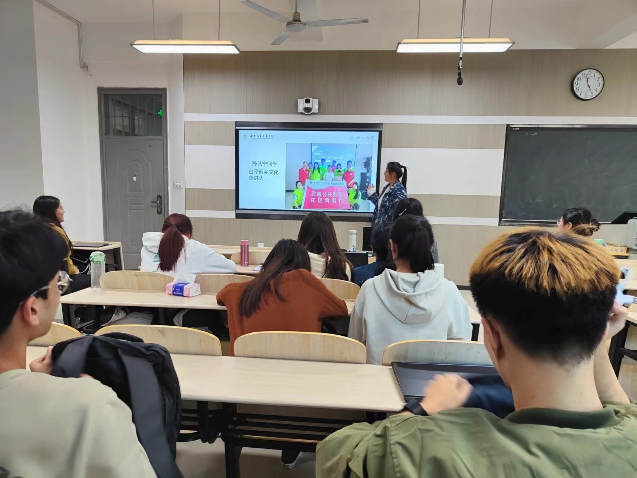 白泽返乡文化宣讲队的孙艺宁同学从实践内容、成果展示两个方面进行了汇报。通过前往淄博科技馆、淄博市周村区北郊镇西坞村等地开展调研和宣讲活动,实践队队员们深入了解了淄博在科技文化、教育等方面的奋斗成果,在科创报国的实践和基层服务中体现青年作为。