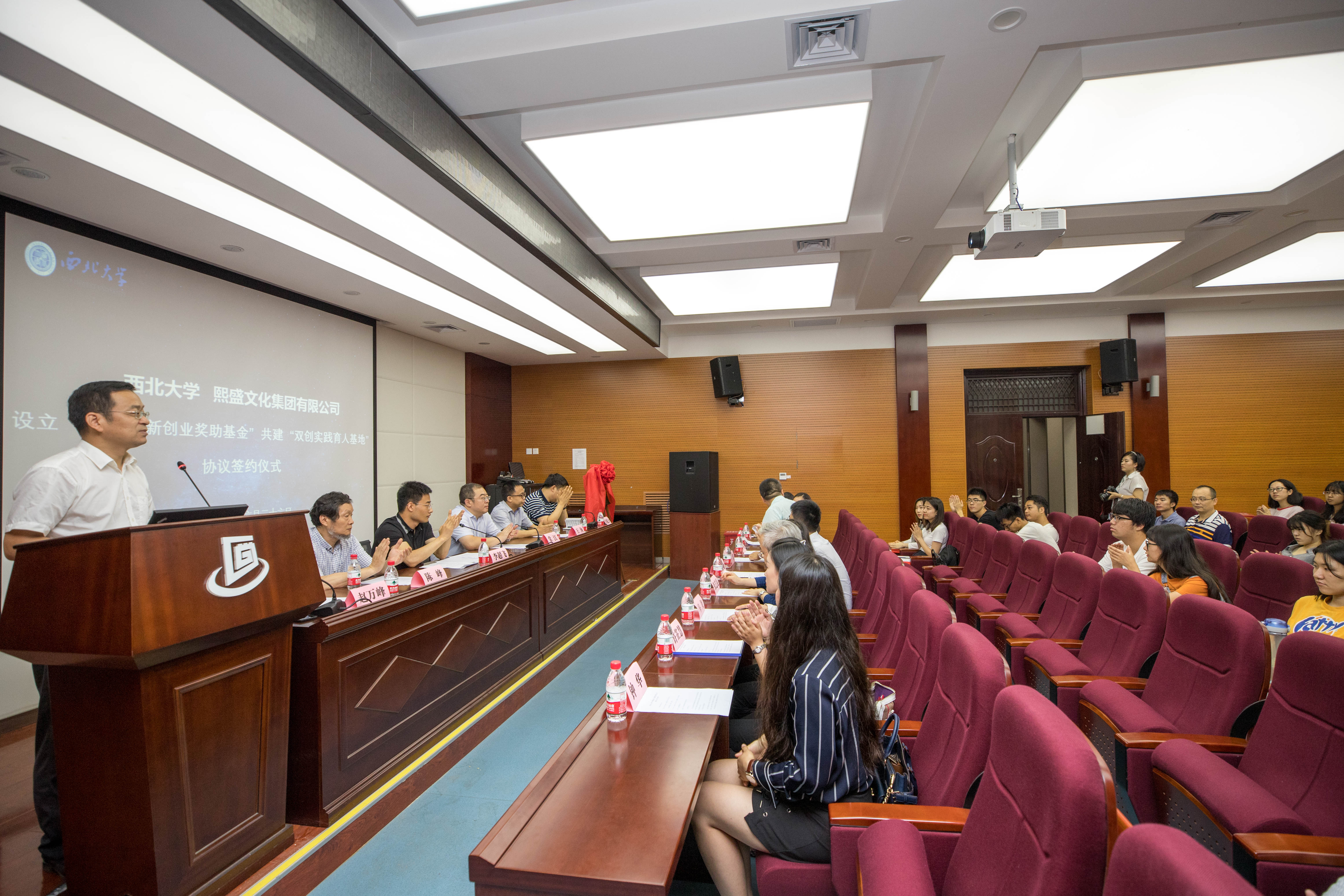 626日上午,qmh球盟会亚博网址及球盟会分别与陕西熙盛文化集团有限公司签订合作协议,并在太白校区举行“双创实践育人基地”揭牌仪式。西安经济技术开发区策划宣传局局长王洵、文明办副主任黄建勋,熙盛文化集团有限公司董事长李超飞、副总经理马玺,学校党委常委副校长常江、国内合作与校友工作处处长崔延力,球盟会院长陈峰、党委书记赵万峰、副院长张艺昆、党委副书记樊涛及部分教师与学生代表参加了签约仪式。