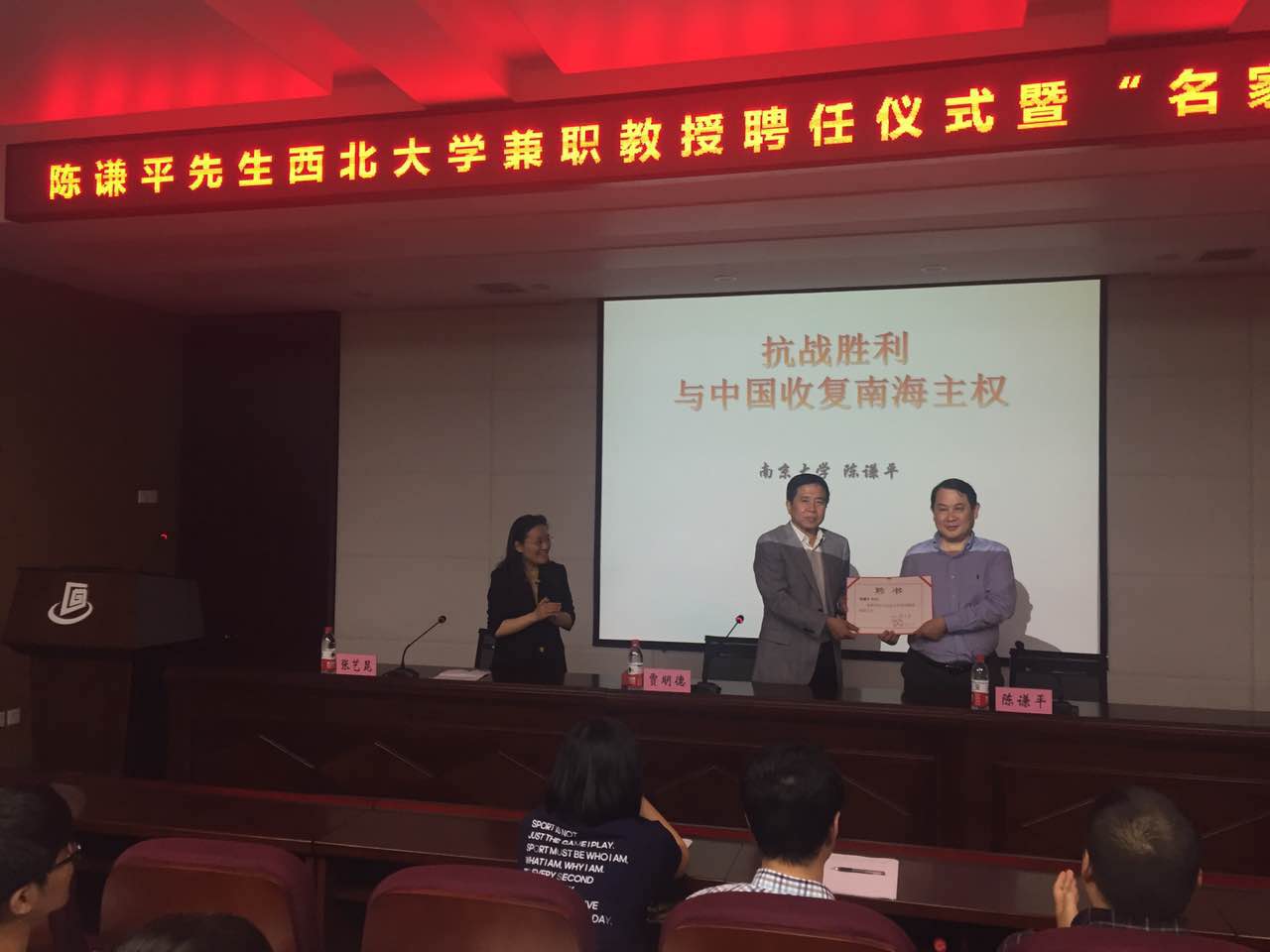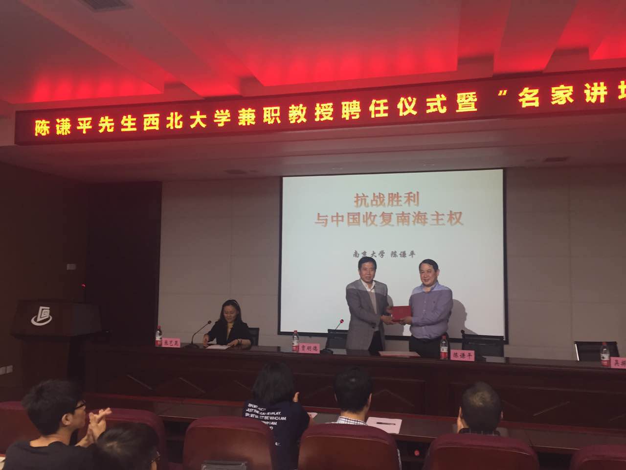 聘任仪式后,陈谦平先生应邀向在场师生作了题为“抗战胜利与中国收复南海诸岛主权”的学术报告。陈谦平教授指出,抗战是中华民族复兴的枢纽,对于南海问题而言,抗战同样是一个重要的节点。报告从九段线的起点、晚清政府对南海诸岛的主权宣示、法占南海九岛与国民政府划定《中国南海各岛屿图》、法国侵占西沙群岛、日本侵占中国南海诸岛、开罗会议与中国收复南海主权的国际新秩序、抗战胜利后国民政府收回南海主权及其举措等七个方面展开,清晰地勾勒出南海问题的由来及演变,而且澄清了在此问题上的许多误解和不确之处,受到了在场师生的热烈欢迎。