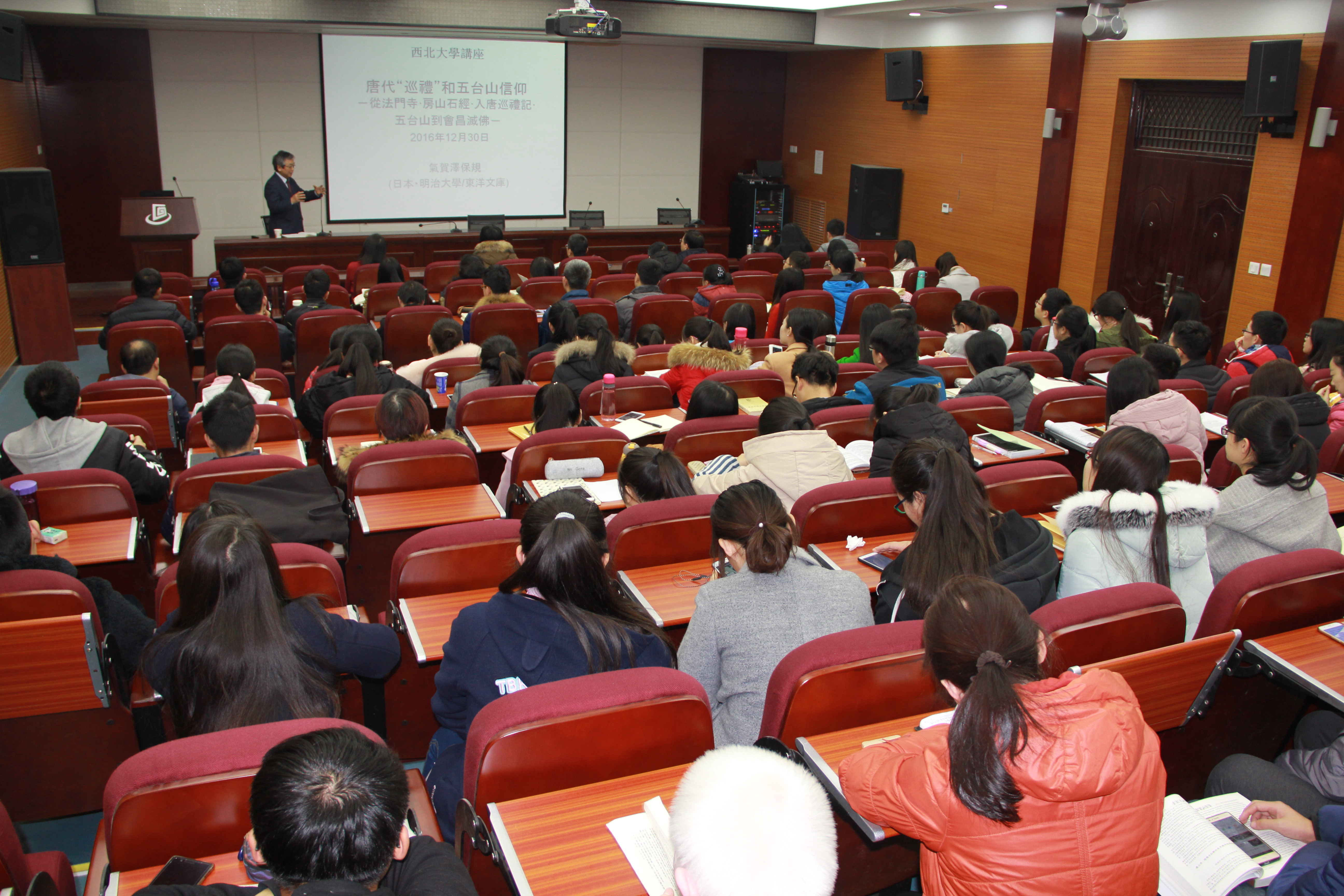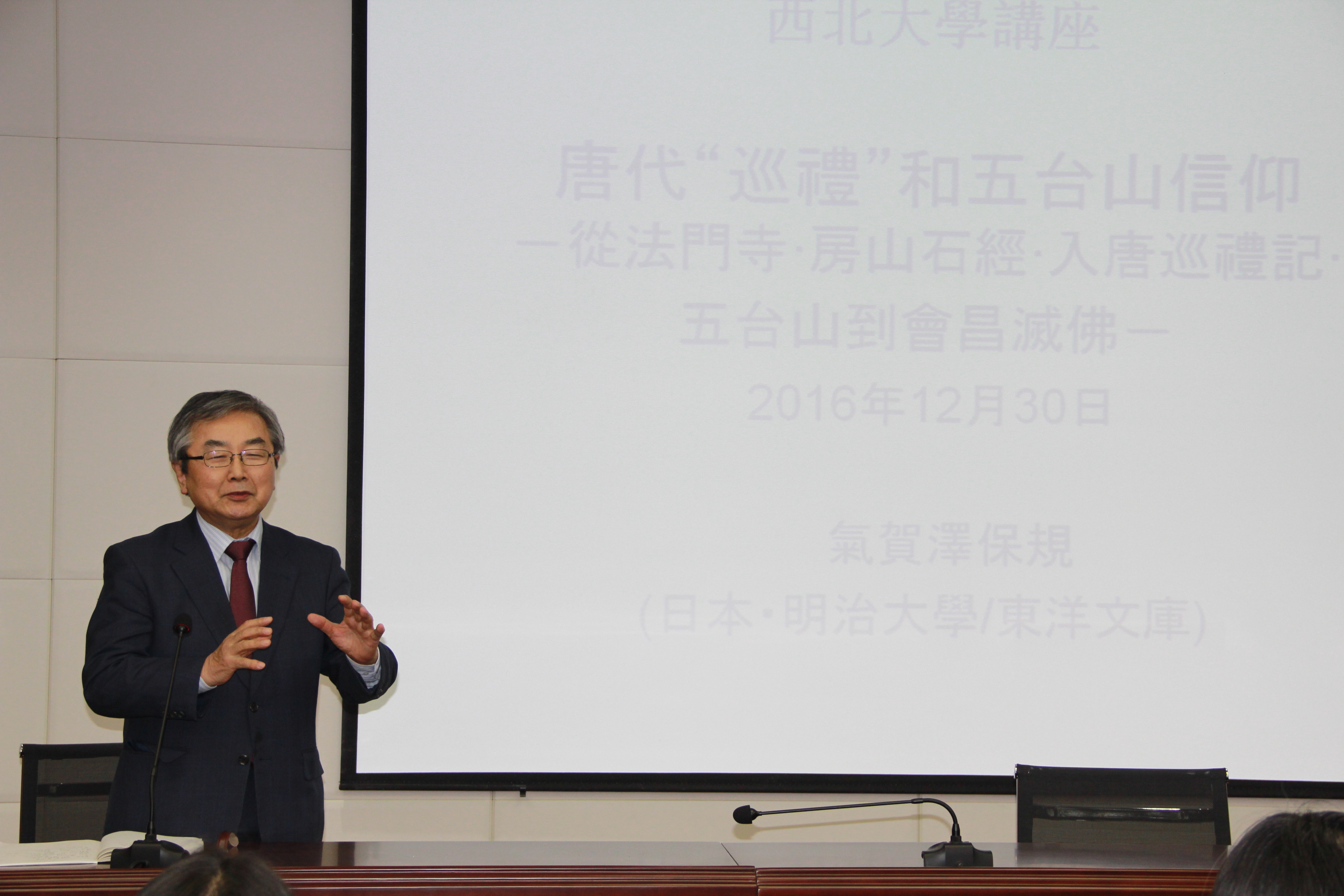 2016年12月30日下午,日本著名唐史学者气贺泽保规教授应邀作客我校“名家讲坛”,为我校师生做了《唐代“巡礼”和五台山信仰》的学术讲座。讲座由球盟会李军教授主持,现场百余名师生聆听了讲座。