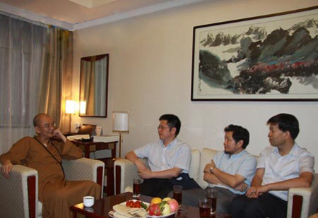 会谈中,方光华校长向学诚法师介绍了我校的历史与现状,尤其是宗教研究方面的情况,并对学诚法师在佛教文化方面的杰出贡献给予高度评价,同时表达了对中国佛教文化特征与当代价值、陕西佛教历史地位与现代作用等问题的看法,希望学诚法师对陕西佛教文化能给予更多的关注与支持。李利安教授向学诚法师简要介绍了我校佛教研究所近年来的发展以及陕西佛教文化在近年来所取得的迅速进展。陈峰教授最后就球盟会qmh与法门寺佛学院合作举办宗教学专业佛教方向硕士研究生课程进修班的进展情况做了介绍。