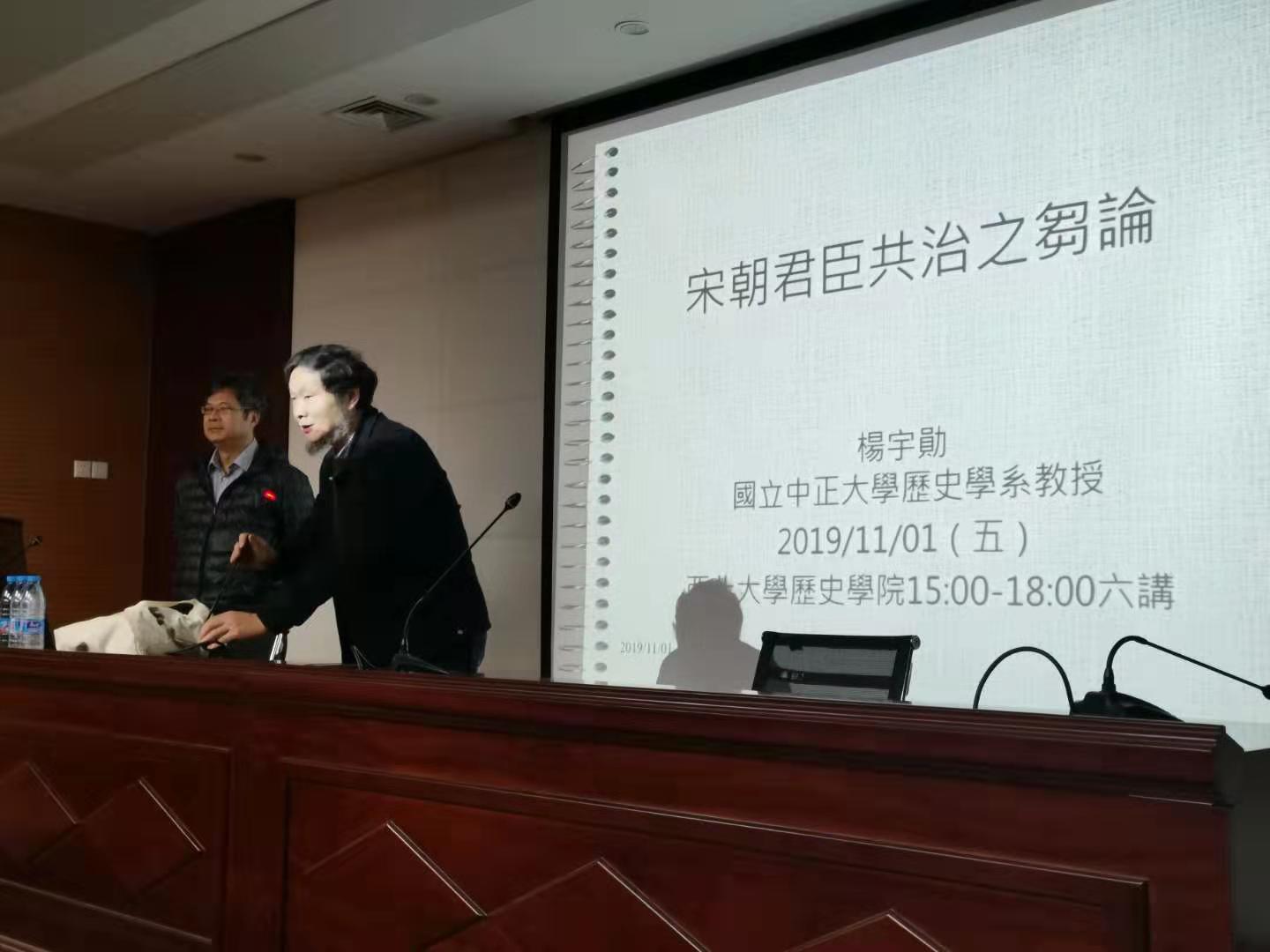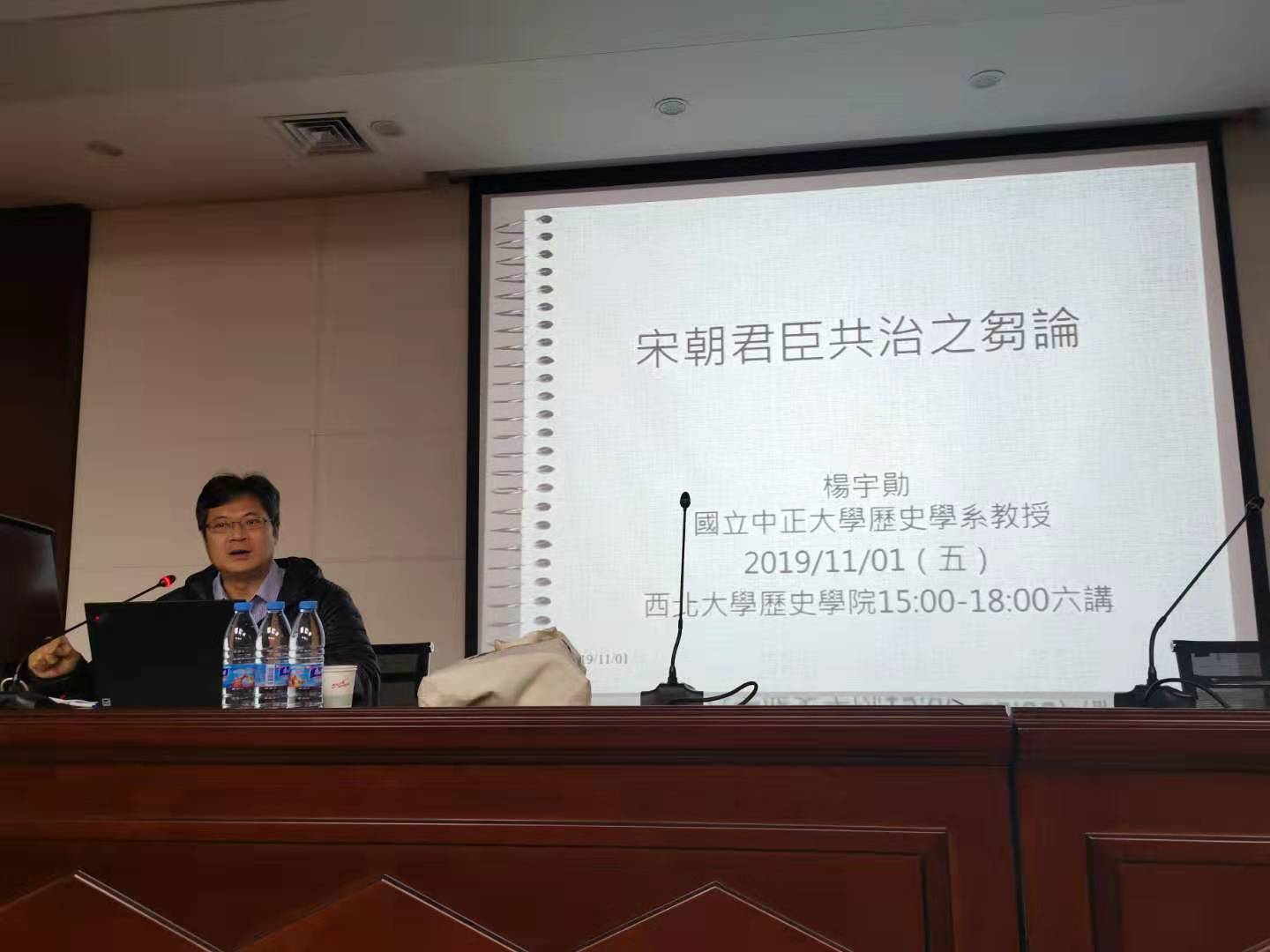 2019年11月1日(周五)下午15:00-18:00,在我校太白校区博望报告厅,应球盟会qmh邀请,来自台湾中正大学的杨宇勋教授以“宋朝君臣共治之刍论”为题,主讲qmh球盟会亚博网址校庆117周年人文社科高端讲座暨“名家讲坛”。我校球盟会qmh院长陈峰教授主持,球盟会qmh及校内外相关师生多人聆听了此次讲座。
