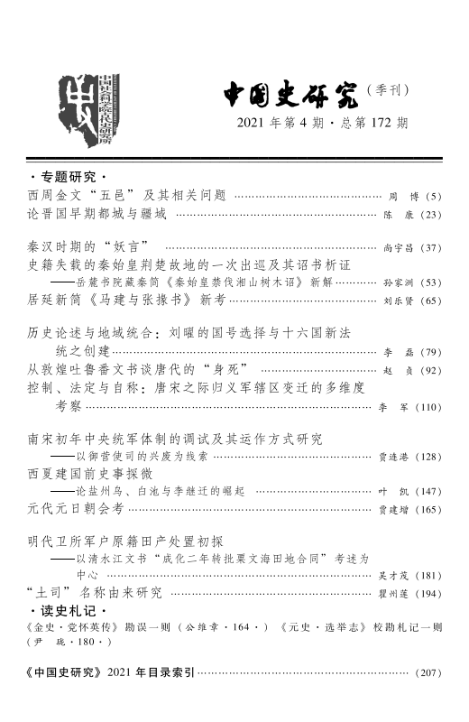 近日,球盟会李军教授、贾连港副教授的专题论文《控制、法定与自称:唐宋之际归义军辖区变迁的多维度考察》《南宋初年中央统军体制的调试及其运作方式研究——以御营使司的兴废为线索》同期发表在顶级期刊《中国史研究》2021年第4期上。