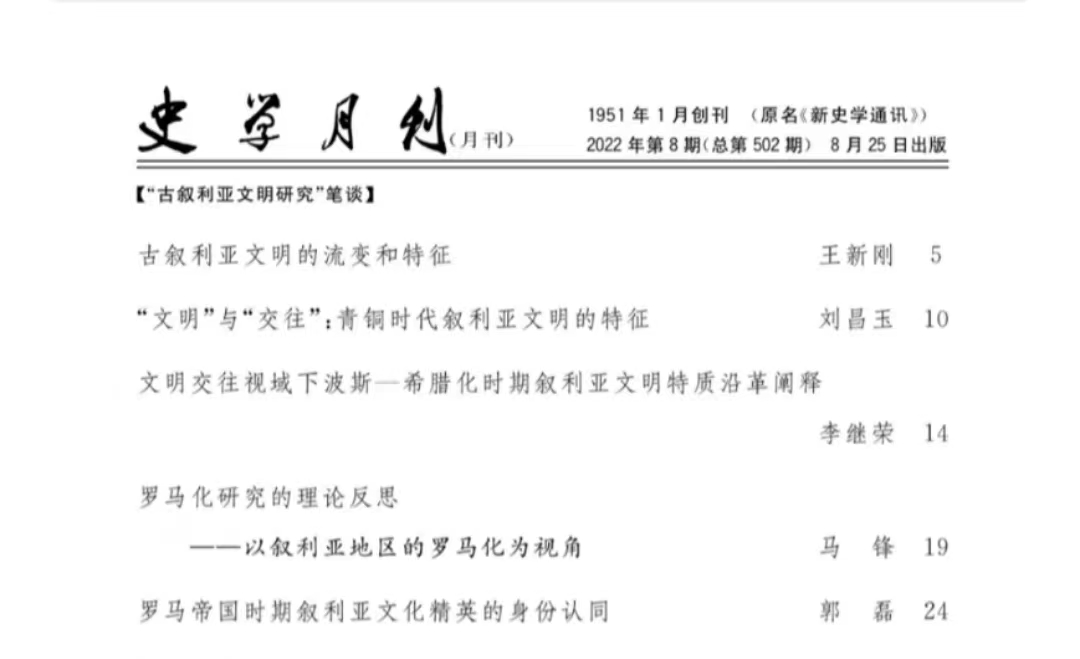 王新刚教授领军的“古叙利亚文明史研究”团队在《史学月刊》发表系列论文