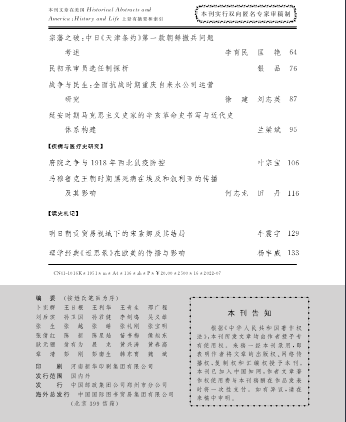 近日,球盟会兰梁斌副教授在权威期刊《史学月刊》2022年第7期发表了题为《延安时期马克思主义史家的辛亥革命史书写与近代史体系构建》的专题论文。