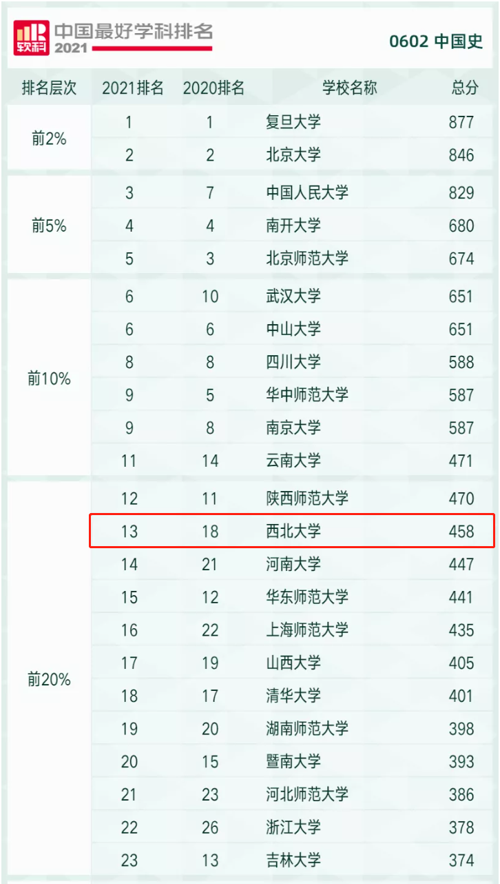 近日,高等教育评估专业机构软科正式发布“2021软科中国最好学科排名”,共有486所高校的4992个学科点上榜。其中,中国史学科排名共有59所大学上榜。我校中国史学科位列第13,居于前20%,相比2020年提升5个名次。