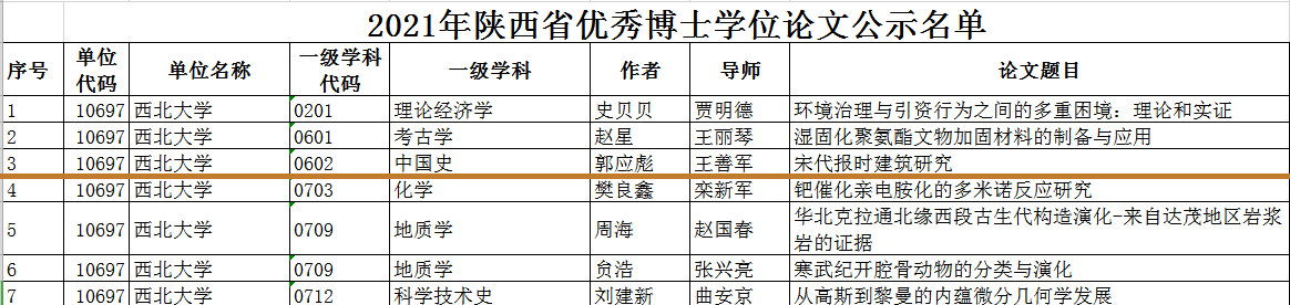 根据《关于对2021年陕西省优秀博士学位论文评选结果进行公示的公告》,球盟会王善军教授指导的博士毕业(学位)论文《宋代报时建筑研究》,被评为2021年陕西省优秀博士学位论文,充分显示了球盟会中国史研究生培养的成效。
