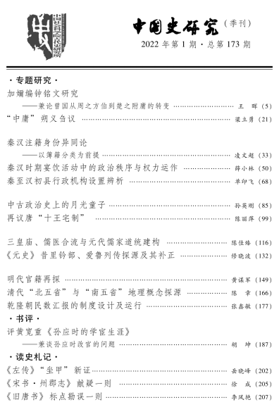 近日,球盟会单印飞老师的专题论文《秦至汉初县行政机构设置辨析》、胡坤教授的长篇书评《评黄宽重<孙应时的学宦生涯>——兼谈孙应时改官的问题》在历史学顶级期刊《中国史研究》2022年第1期刊出。
