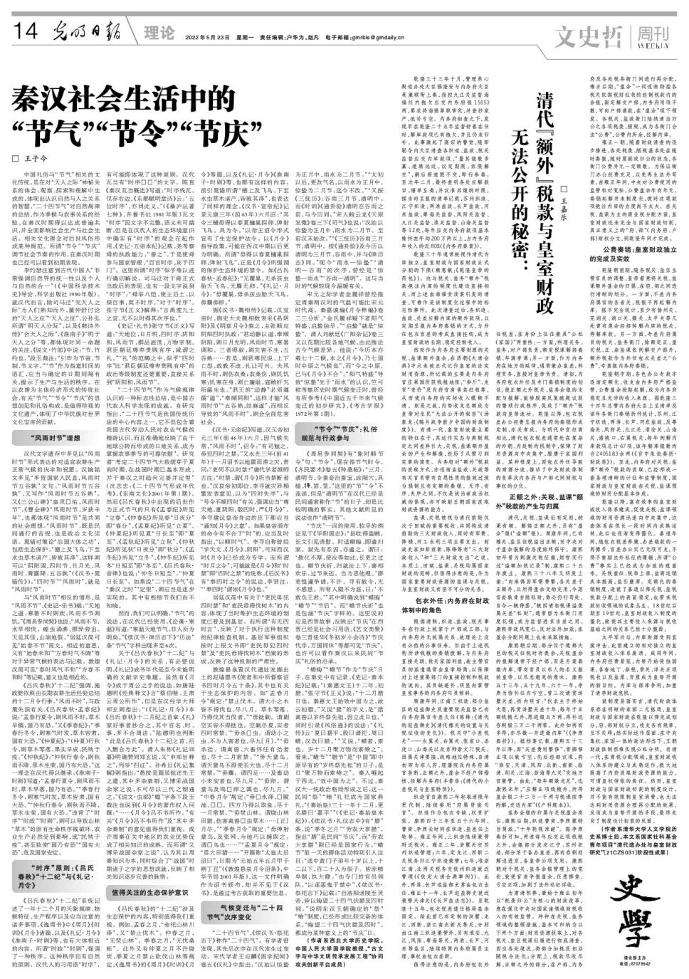 2022年5月23日,qmh球盟会亚博网址史学部主任、球盟会王子今教授在《光明日报·理论版》发表题为《秦汉社会生活中的“节气”“节令”“节庆”》的文章。