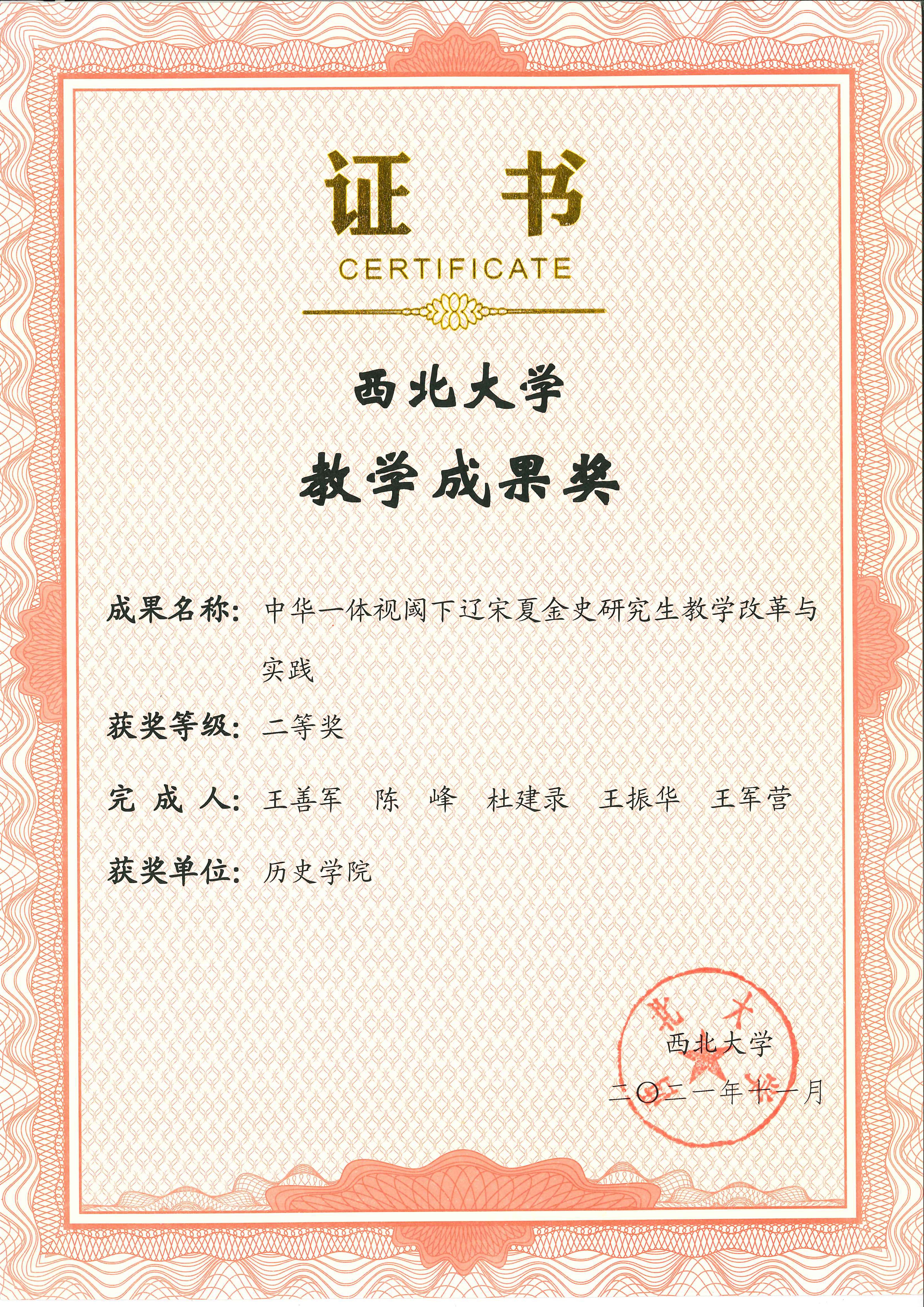 近日,球盟会王善军教授主持完成的教学成果“中华一体视阈下辽宋夏金史研究生教学改革与实践”荣获qmh球盟会亚博网址教学成果奖二等奖。