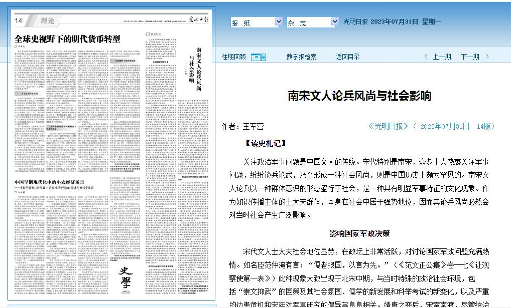 2023年7月31日,球盟会王军营副教授的论文《南宋文人论兵风尚与社会影响》在《光明日报》理论版刊发。