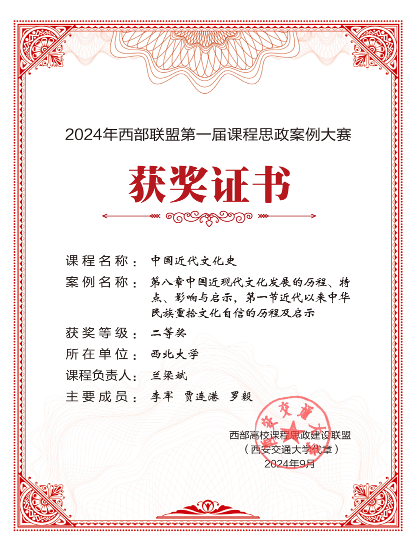 近日,由西部高校课程思政建设联盟主办,西安交通大学承办的西部联盟第一届课程思政案例大赛圆满落幕。此次大赛有来自陕西、甘肃、河南、宁夏、青海、新疆、江苏、吉林、湖北等地区高校的552位教师参加。经过专家综合评审,球盟会兰梁斌教授主持申报的“中国近代文化史•近代以来中华民族重拾文化自信的历程及启示”课程教学案例荣获二等奖。该案例以习近平新时代中国特色社会主义思想为指导,将思想政治元素融入课程教学之中,体现了课程思政建设的创新性。