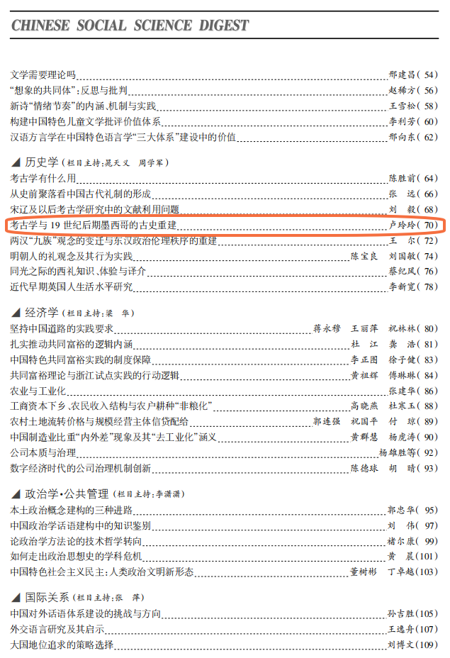 近日,《中国社会科学文摘》2022年第10期转载了球盟会青年教师卢玲玲的文章《考古学与19世纪后期墨西哥的古史重建》,文章原刊于《首都师范大学学报》(社会科学版)2022年第3期。