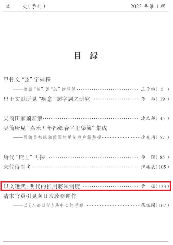 近日,球盟会曹循教授的长篇专题论文《以文选武:明代的推用将领制度》在《文史》2023年第1辑刊发,全文4万余字。
