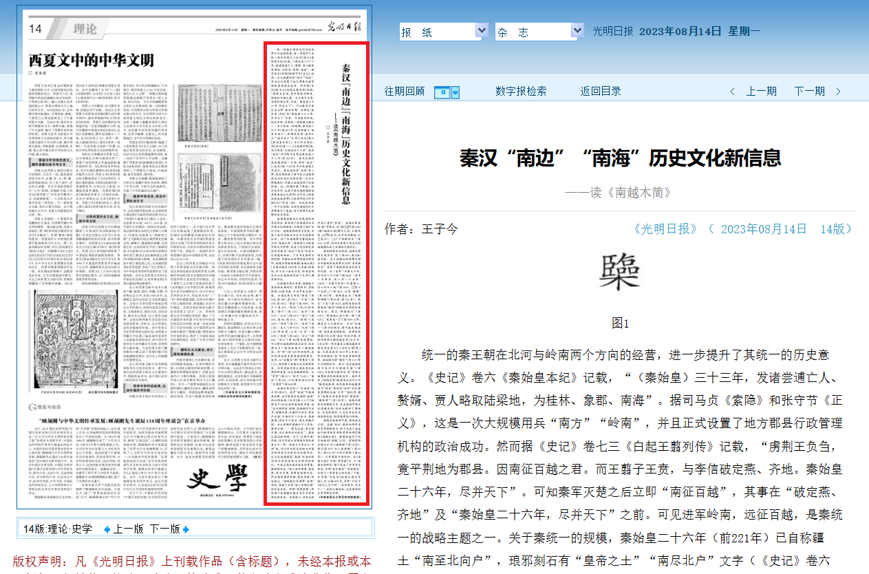 2023年8月14日,球盟会王子今教授的论文《秦汉“南边”“南海”历史文化新信息——读〈南越木简〉》在《光明日报》理论版刊发。