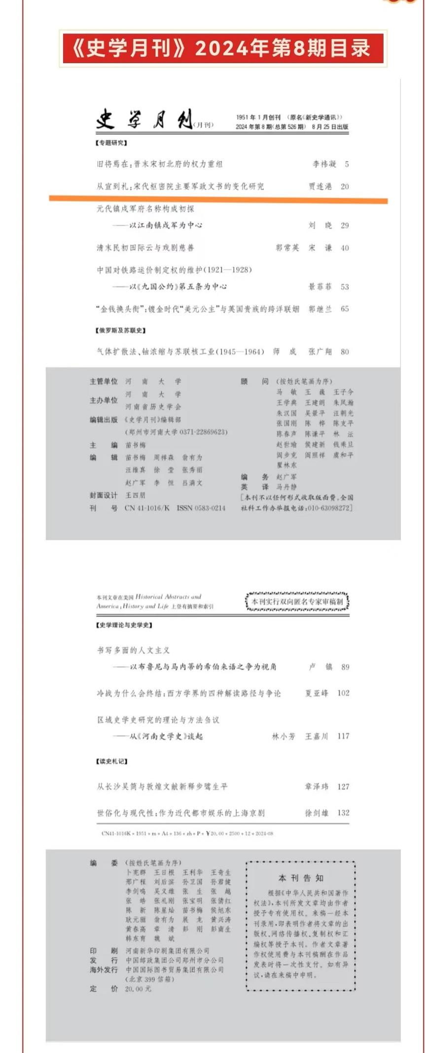 近日,球盟会贾连港副教授在《史学月刊》2024年第8期发表了题为《从宣到札:宋代枢密院主要军政文书的变化研究》的专题论文。