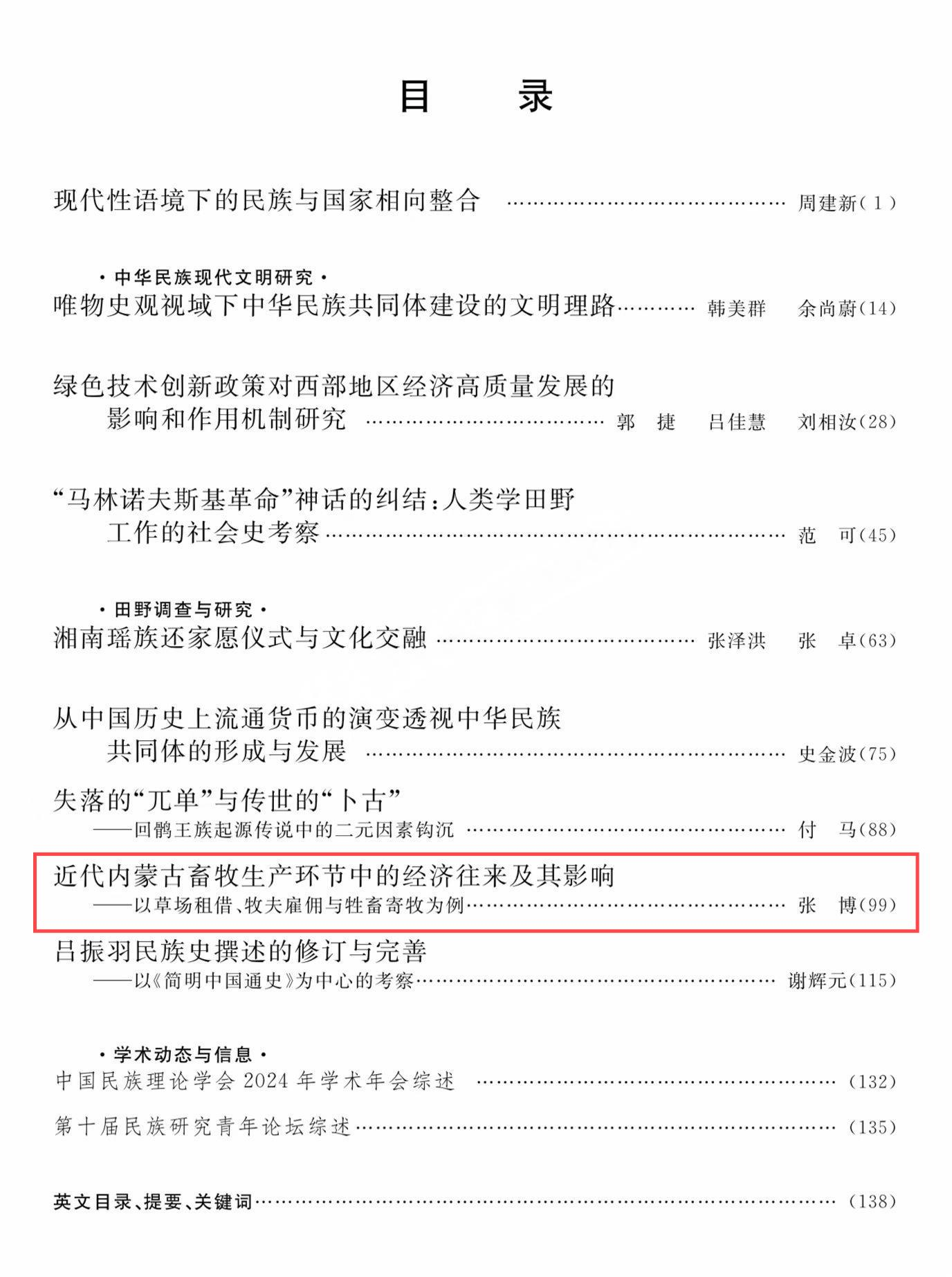 近日,球盟会张博副教授的论文《近代内蒙古畜牧生产环节中的经济往来及其影响——以草场租借、牧夫雇佣与牲畜寄牧为例》在权威期刊《民族研究》2024年第5期发表。